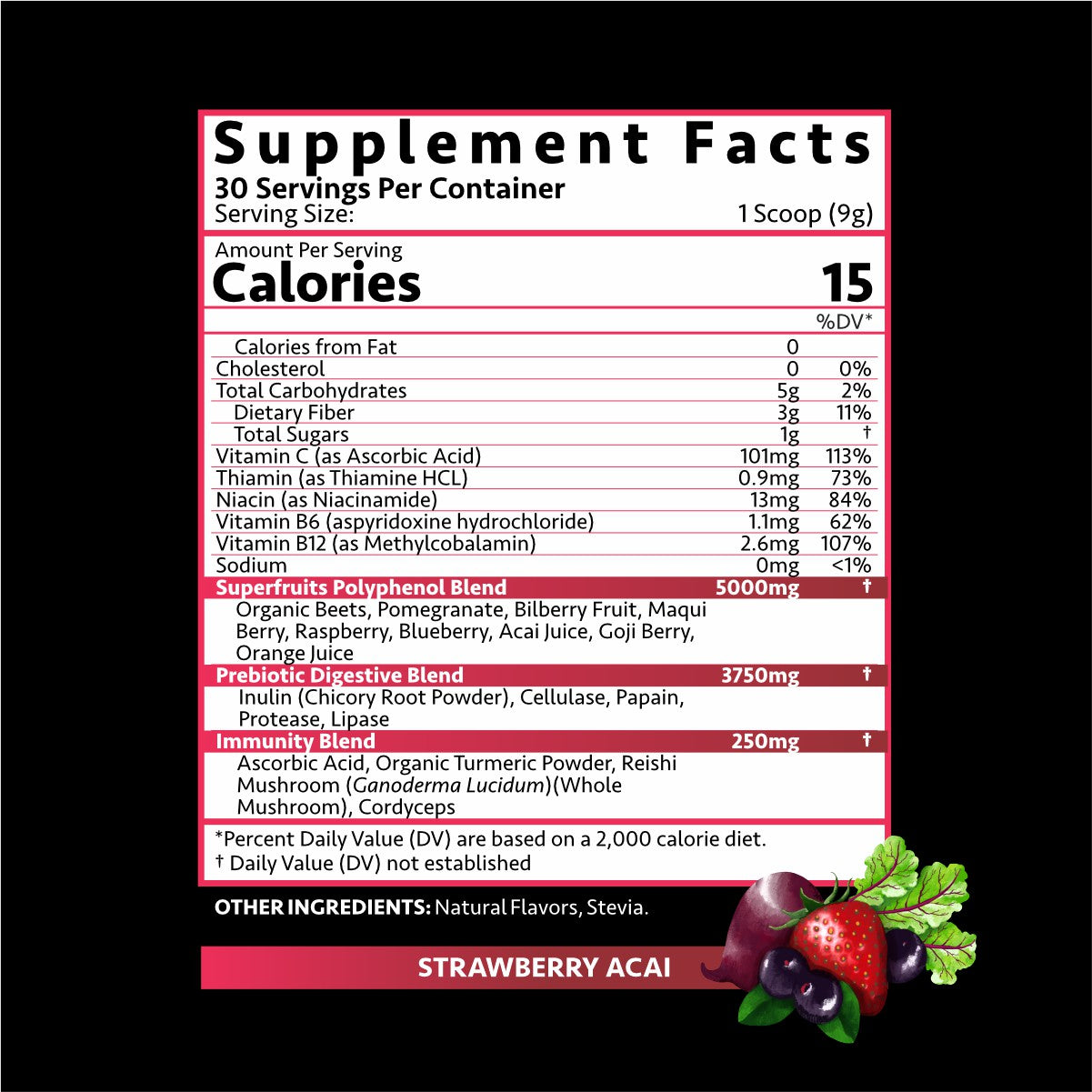 Combines a potent mix of superfruits, delivering a rich source of antioxidants to combat free radicals and support overall health. -